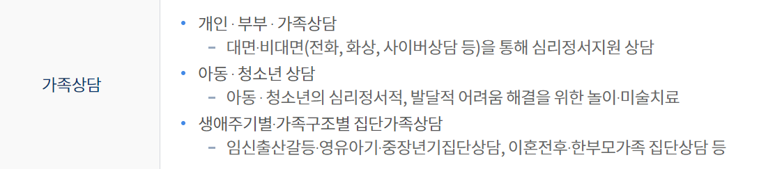 서울시 가족센터에서는 서울시 거주자 또는 생활영역권자(직장소재지가 서울인 경우)를 대상으로 가족 내 갈등과 문제 해결을 돕기 위해 가족상담을 제공하고 있습니다.