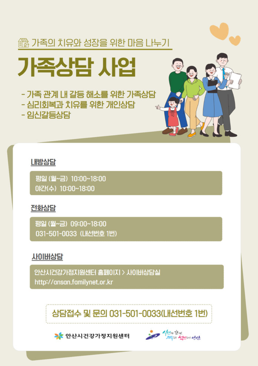 안산시의 건강가정지원센터에서는 가족상담사업을 진행중에 있습니다.