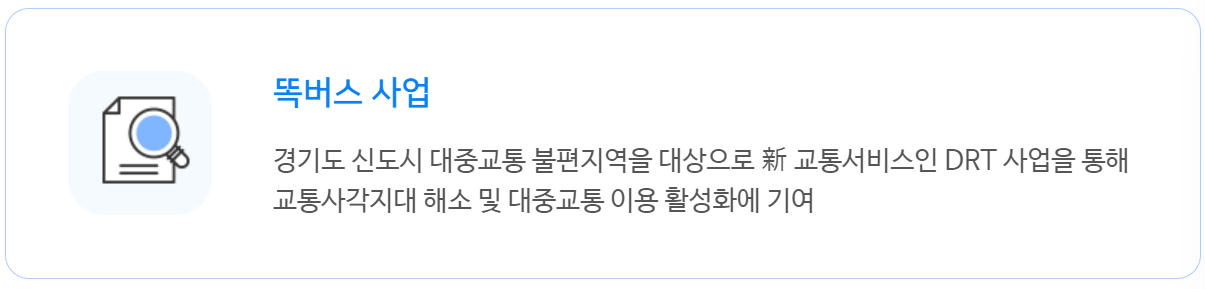 똑버스는 경기도에서 제공하는 스마트 대중교통 서비스로, 기존의 버스와 다르게 승객의 요구에 따라 경로를 유연하게 변경하는 시스템입니다. 이용자는 스마트폰 앱을 통해 버스를 요청하고, 가장 가까운 위치에서 탑승할 수 있습니다. 대중교통 접근성이 낮은 지역 주민들에게 매우 유용한 서비스입니다.