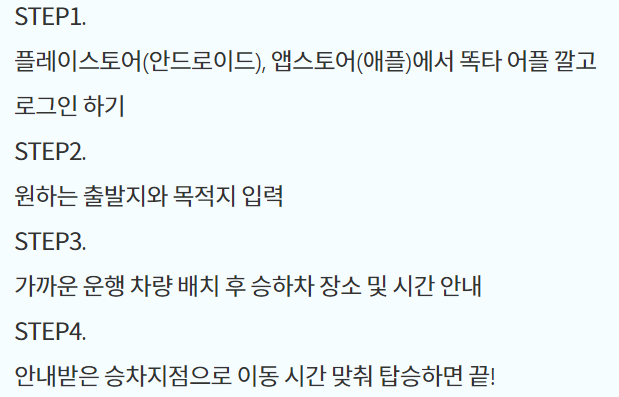 먼저 스마트폰에 똑버스 전용 앱인 똑타 앱을 다운로드 합니다. 설치 후 회원가입을 진행하고 신용카드 또는 체크카드를 등록합니다. 앱에서 출발지는 현재 위치 주변으로 설정하고 도착지 검색을 선택합니다. 지도에서 직접 선택하는 것이 편리합니다. 똑버스에서 지정해준 정류장으로 이동하여 똑버스가 도착하면 목적지를 확인하고 탑승합니다. 환승할인도 적용되므로 하차시에 꼭 태그하시기 바랍니다.