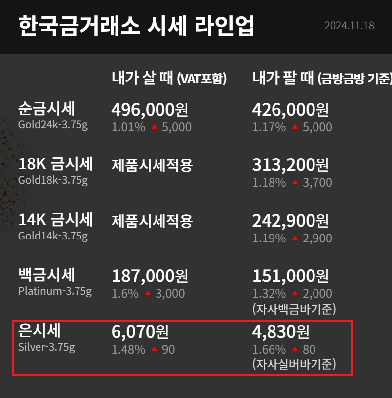 은 1돈의 시세는 2024년 11월 중순기준으로 한 돈에 살 때 vat포함 6,070원입니다. 팔 때는 4,830원입니다. 은 시세는 매일 변동되기 때문에 자주 확인해야 합니다. 아래 한국 금거래소 홈페이지에서 내용을 확인할 수 있습니다.