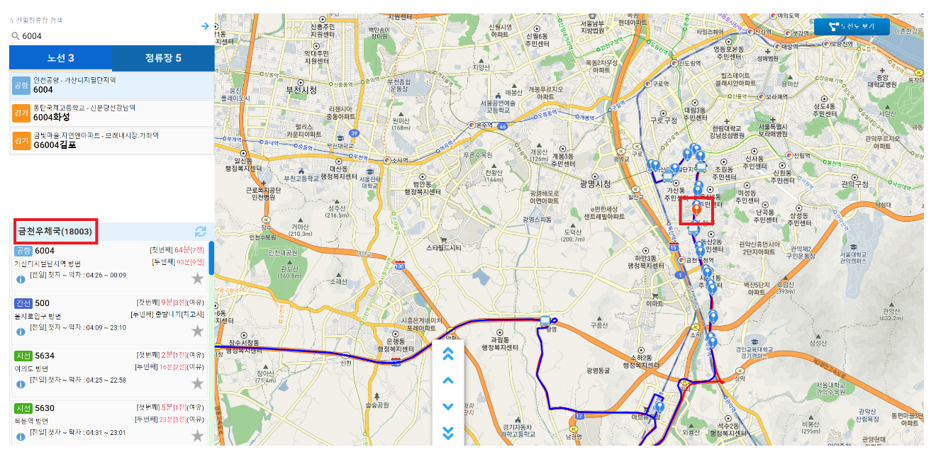 지도 내에서 현재 있는 위치를 누르면 왼쪽 탭에서 버스 도착 예상시간을 확인할 수 있습니다.