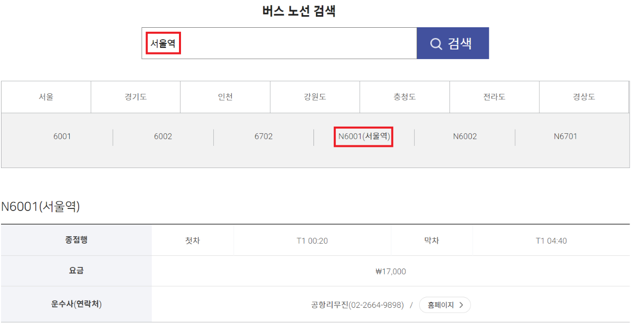만약 서울역을 검색한다면 운행하는 버스번호가 뜹니다. 이것을 클릭하여 첫차와 막차 시간을 알 수 있으며 요금, 운수사 연락처까지 확인할 수 있습니다. 조금 내려보시면 노선 시간표, 노선정보도 함께 나타나므로 여기서 버스 시간표를 보시면 됩니다.