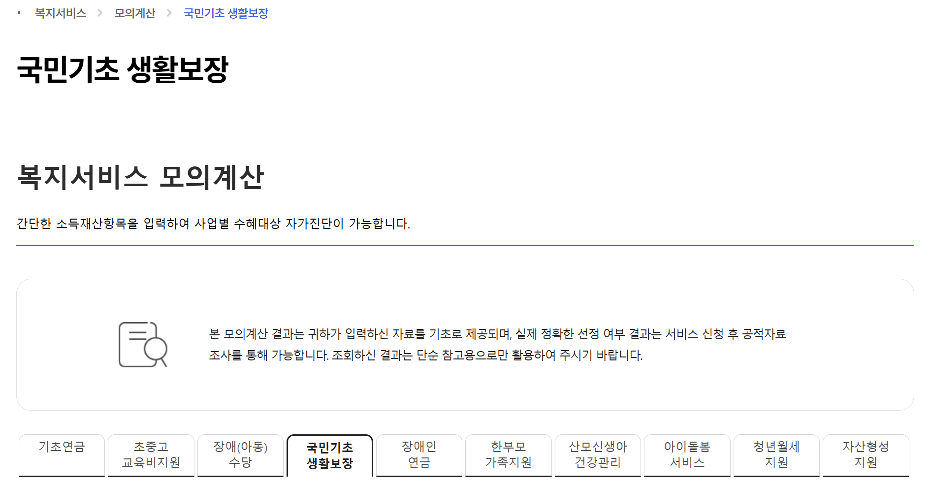 중위소득 확인방법은 복지로 사이트에서 모의계산으로 통해 알아볼 수 있습니다. ▶ 복지로 접속 > 복지서비스 > 모의계산 > 국민기초 생활보장 클릭 > 복지서비스 모의계산